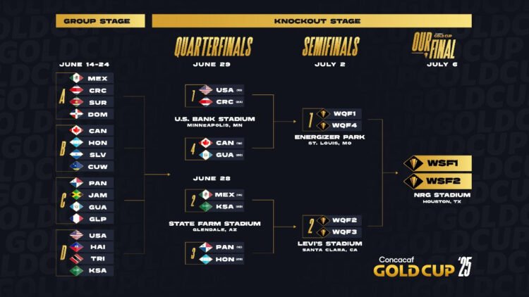 La Fase de Eliminación Directa de la Copa Oro Concacaf 2025 se llevará a cabo entre el 28 de junio y el 6 de julio, comenzando con los Cuartos de Final el 28 y 29 de junio en el State Farm Stadium en Glendale, AZ, y el U.S. Bank Stadium en Minneapolis, MN, respectivamente, seguido por las Semifinales el 2 de julio en Levi’s Stadium en Santa Clara, CA, y Energizer Park en St. Louis, MO, y culminando con la Final el 6 de julio en NRG Stadium en Houston, Texas.