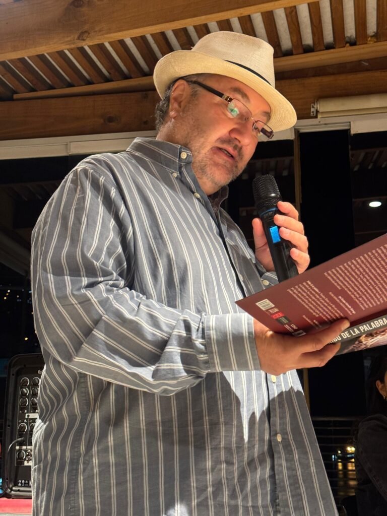 El poeta y artista visual Theodoro Elssaca da testimonio desde sus libros durante el Homenaje al amigo Juan Luis Martínez, en Valparaíso.