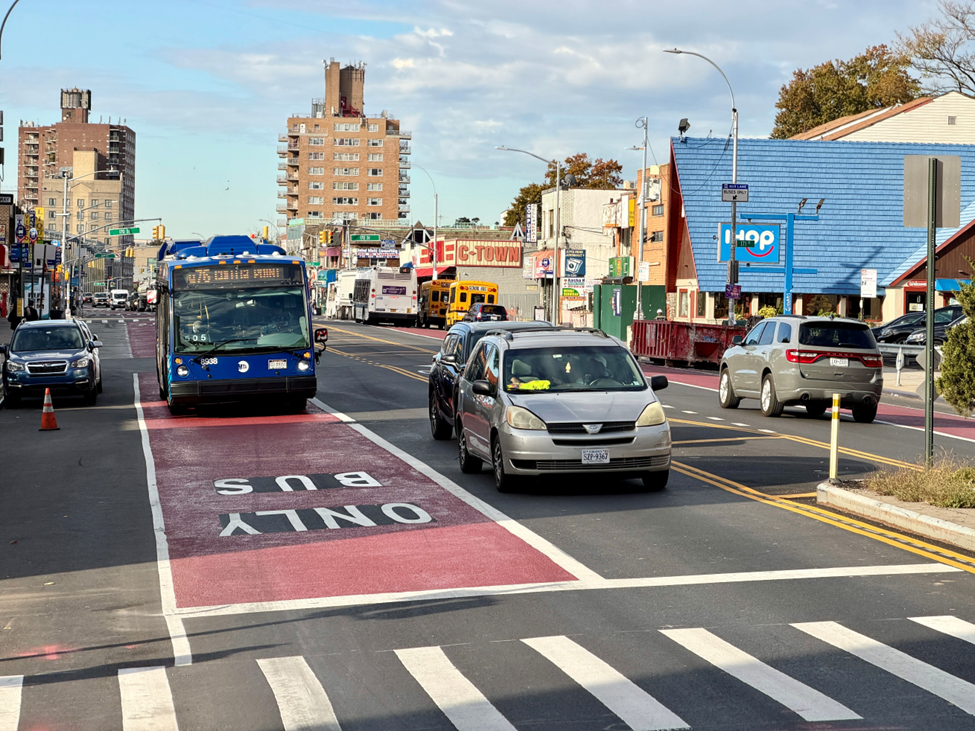 Imagen de los nuevos carriles bus instalados en Hillside Avenue, que ofrecen autobuses más rápidos y tiempos de espera más cortos para más de 215,000 pasajeros diarios. Crédito: NYC DOT.