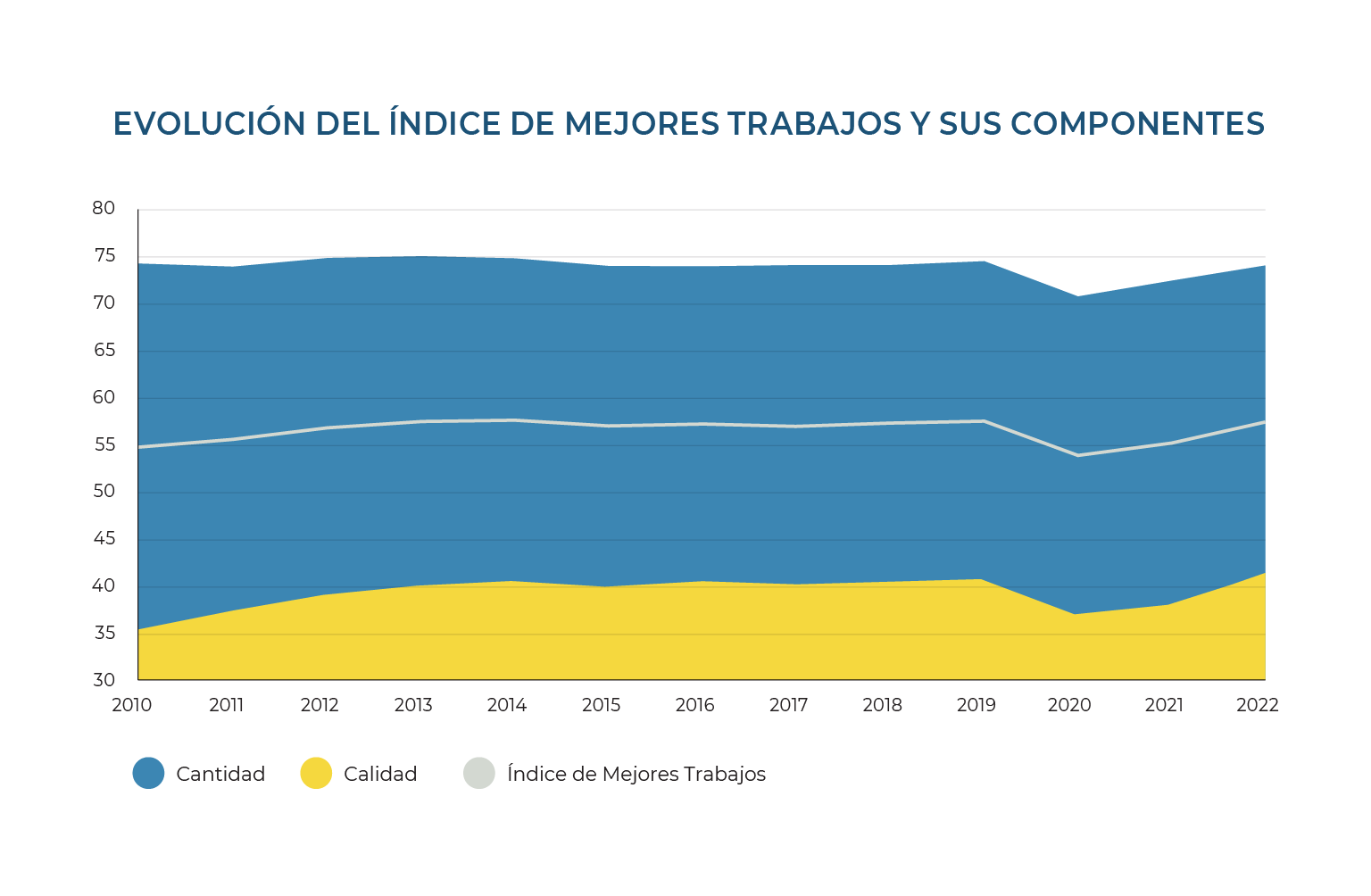 Según el informe Índice de Mejores Trabajos 2024, la evolución de la calidad del empleo ha sido lenta desde 2010 y, al ritmo actual de crecimiento, llegar a unos 70 puntos tomaría casi 48 años. La dimensión de cantidad ha tenido un comportamiento más o menos estable con una caída en 2020 producto de los efectos de la pandemia en el empleo, recuperándose para 2022.