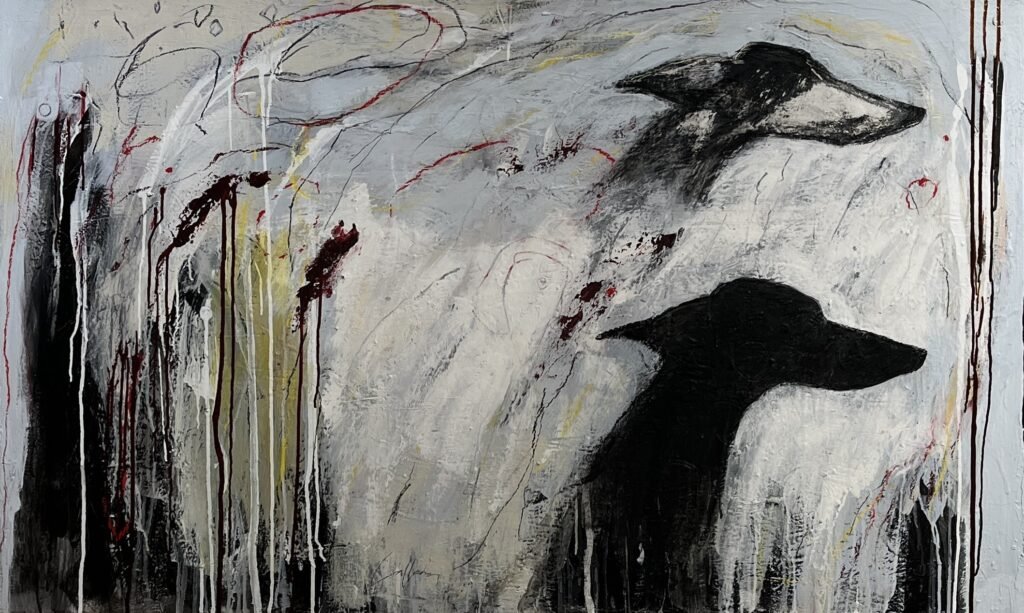 La mancha, gesto y dibujo asediados por rápidos trazos en oleos, carbón y medios mixtos; rayados, elementos punzantes también, buscando otorgar a mis escenas un hálito de urgencia.