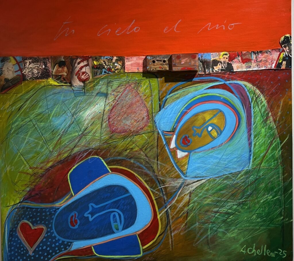 En Las obras de Chellew, generalmente encontramos un motivo que se replica en cada una de ellas. Esto se grafica en la presencia de dos planos o mundos, unidos o separados por un horizonte transversal compuesto por una línea de viaje permanente, la mayoría con fotografías y/o residuos. Esta duplicidad de planos distintos que intentan vincularse, permanece en la historia personal del artista, quien los interviene con textos y gestos que nos sitúan en espacios y tiempos específicos.