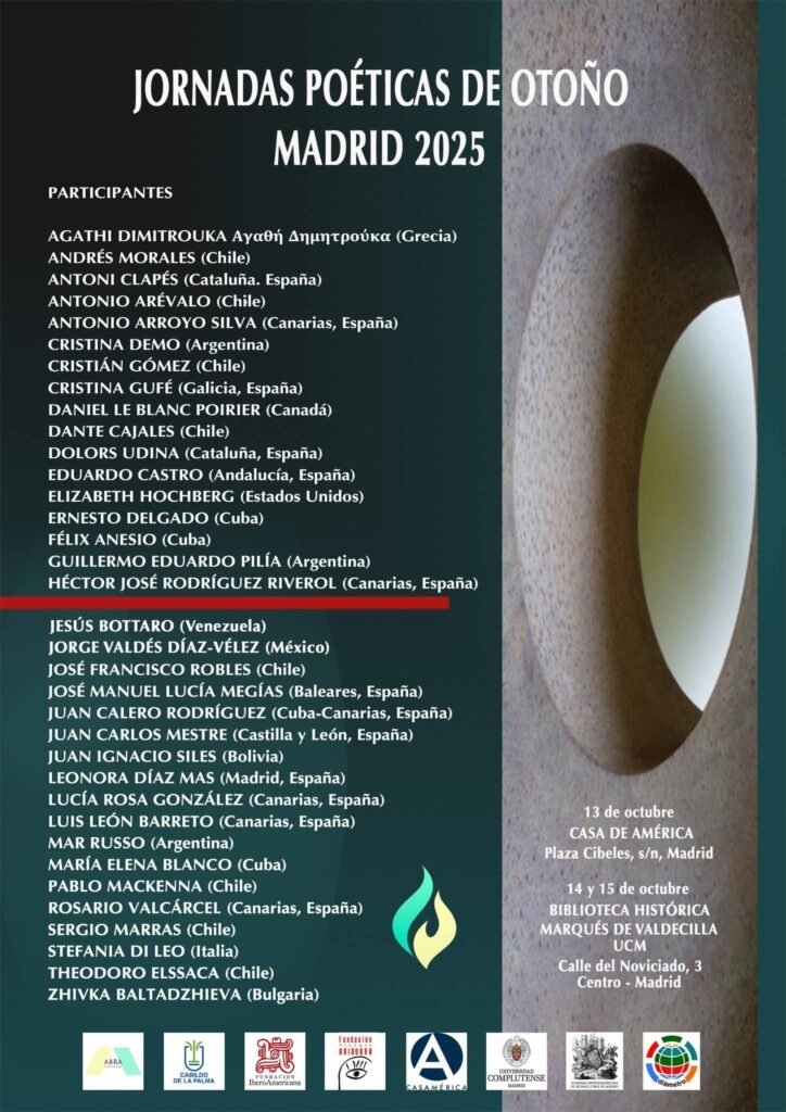 Este lunes fueron inauguradas las Jornadas Poéticas de Otoño, en Casa de América de Madrid, por sus organizadores los poetas Andrés Morales, Juan Calero y Guillermo Pilía. Entre los autores invitados que protagonizan esta versión se encuentran Stefania Di Leo, de Italia, Theodoro Elssaca, de Chile y Juan Carlos Mestre, de España.