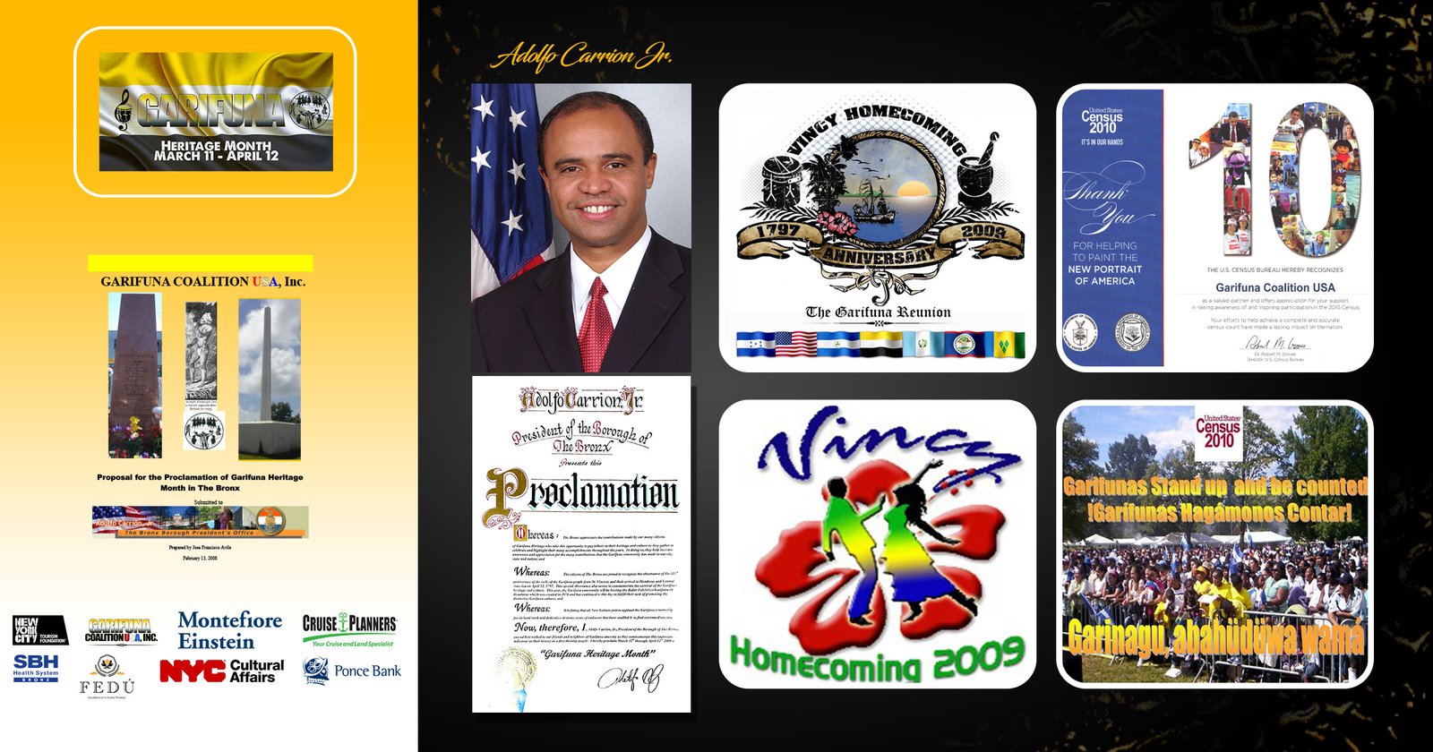 El Mes de la Herencia de Garifuna se celebró por primera vez en la ciudad de Nueva York, por proclamación del presidente del municipio del Bronx, Adolfo Carrión, Jr., el 11 de marzo de 2009, a petición de la Coalición Garifuna USA, Inc., como parte integral de sus esfuerzos para crear conciencia sobre la comunidad Garífuna en la ciudad de Nueva York.