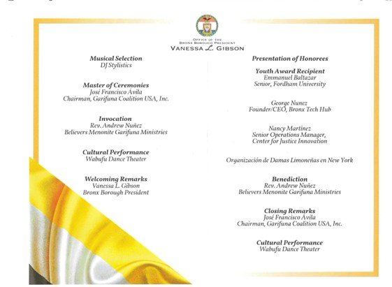 La celebración contó con cautivadoras actuaciones culturales del Teatro de Danza Garífuna Wabafu e inspiradoras presentaciones de menciones de homenajes. El evento proporcionó una plataforma para reconocer las contribuciones significativas de los individuos garífunas al Bronx y a la ciudad de Nueva York en general, incluyendo a Genoveva Castillo, miembro de la Organización de Damas Limoneñas en Nueva York, George Núñez, Fundador/CEO del Bronx Tech Hub, la Oficial Nancy Martínez, miembro de la Asociación Garífuna Americana de Aplicación de la Ley y Gerente Senior de Operaciones del Centro para la Innovación en la Justicia/Soluciones Comunitarias del Bronx, y Emmanuel Baltazar, estudiante de último año de la Universidad de Fordham, encarna el espíritu de servicio y liderazgo.