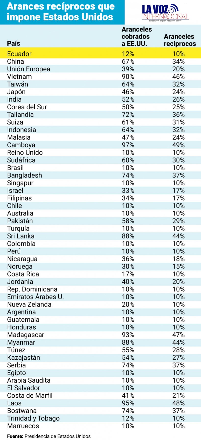 La lista publicada detalla cómo la mayoría de los otros países están sujetos a un arancel del 10%, que es un punto porcentual más alto que las cifras previas propuestas por Trump. Puedes explorar la lista completa y encontrar información específica sobre cada país, mostrando el impacto de estas decisiones en las relaciones comerciales y la economía global. La Casa Blanca también proporcionó gráficos y datos para una mejor comprensión de la situación actual. Para acceder a la lista completa de los nuevos aranceles por país, utiliza las flechas en la parte inferior de la tabla para navegar entre las páginas.