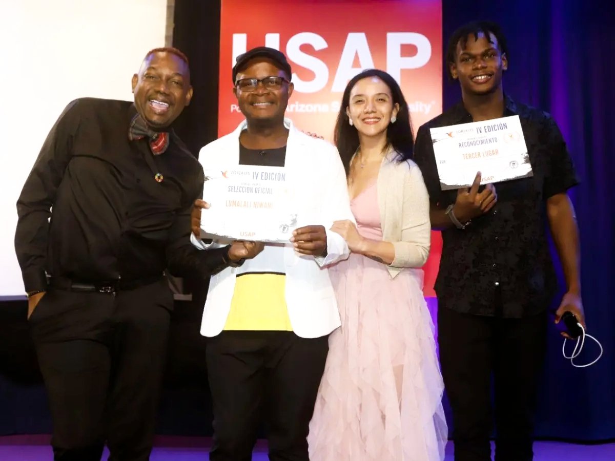 Izq-der. Thurito Martinez Gestor Cultural con base en Nueva York, Nery Bernardez, Laureado director de Lumalali Niwani, Dra. Nadesha Ordonez, Mael Barrios, Actor Protagónico de Lumalali Niwani, Ganador del Mejor Actor Protagónico Latino Film Market Fest de Nueva York 2025.