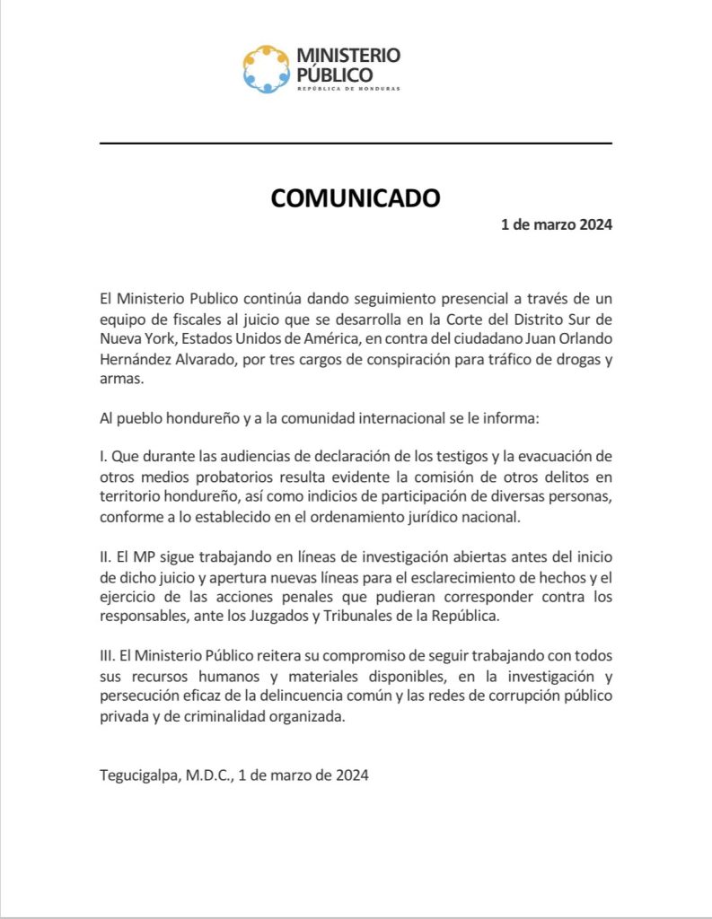 El ente acusado del Estado de Honduras conformó un equipo de fiscales para que viajara hasta Nueva York, Estados Unidos, para que presenciara el juicio del exgobernante hondureño acusado por narcotráfico.