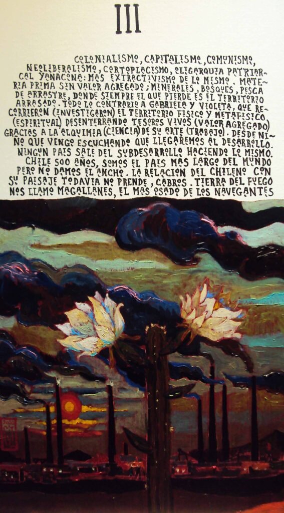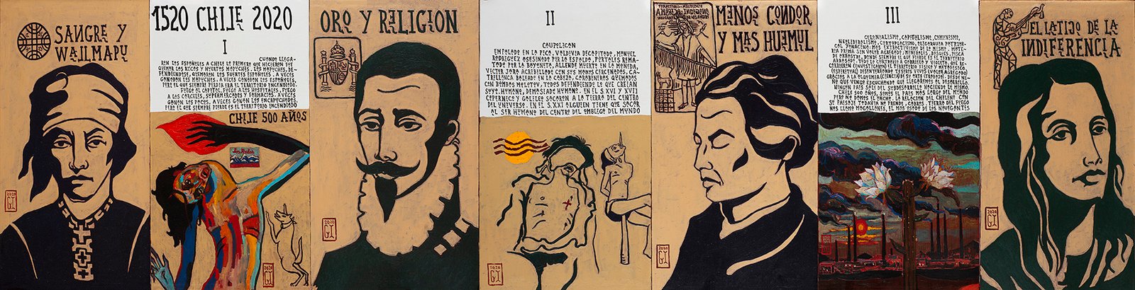 La obra utiliza la gráfica, el afiche, la iconografía (personajes singulares), la pintura y el relato manuscrito para dar una visión crítica desde la etnografía y la ecología —desde la libertad de la plástica— de los 500 años de Chile, donde se manifiesta la violencia racial (la conquista), la violencia ideológica (la dictadura), la violencia urbana (el estallido social) asociadas al patriarcado, el colonialismo, al cortoplacismo y el extractivismo y la degradada relación de los chilenos con su paisaje y hábitat.