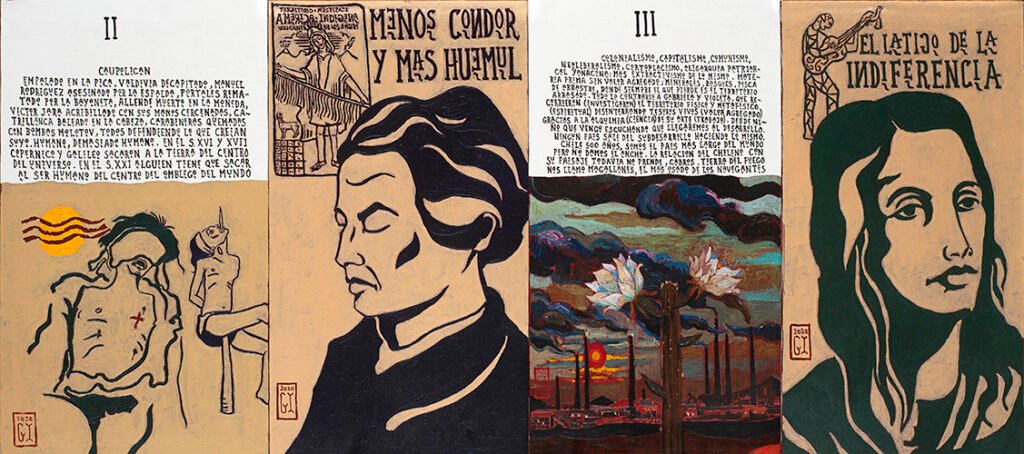 A través de las imágenes de cuatro figuras icónicas de nuestra historia (Lautaro, Pedro de Valdivia, Gabriela Mistral y Violeta Parra), la pintura también contrapone la asimetría de lo masculino con lo femenino en quienes escriben la historia y en quienes la hacen más profunda y sagrada. Esta pintura fue parte de la muestra “La memoria del hábitat: me olvidé de olvidarte” en galería Bahía Utópica, Valparaíso, en el 2021.