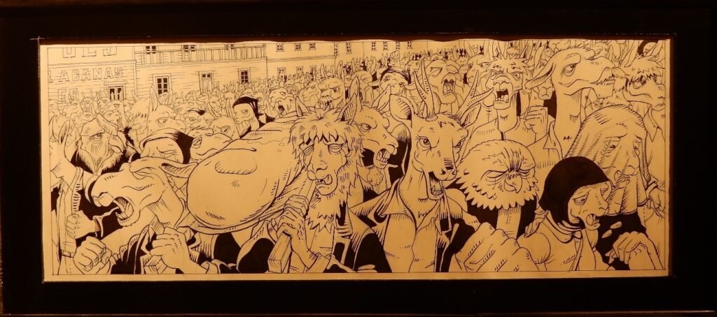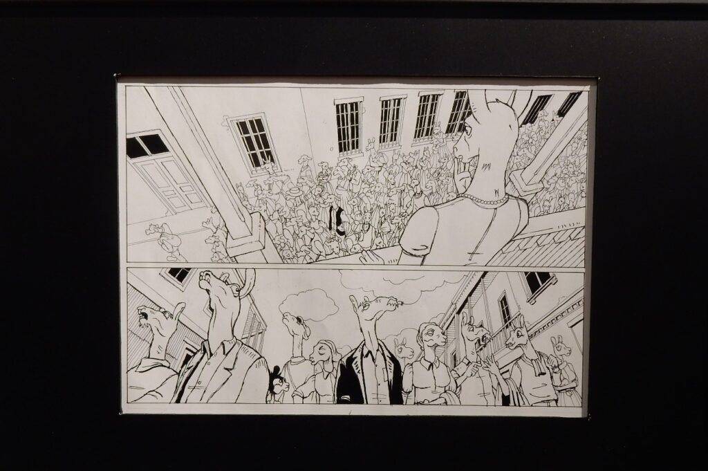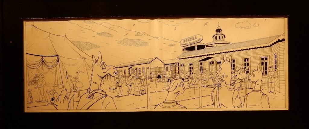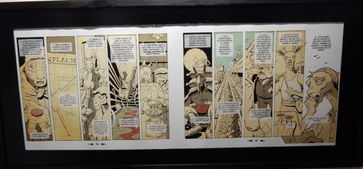 Pedro Prado nos trae originales de la novela gráfica “Santa María 1907”, partes 1 y 2, adaptación al lenguaje del cómic que hace de la novela “Santa María de las flores negras” del premio nacional de literatura Hernán Rivera Letelier. Es una historia contextualizada en lo que se conoce como la matanza de la Escuela Santa María de Iquique, ocurrida en 1907.