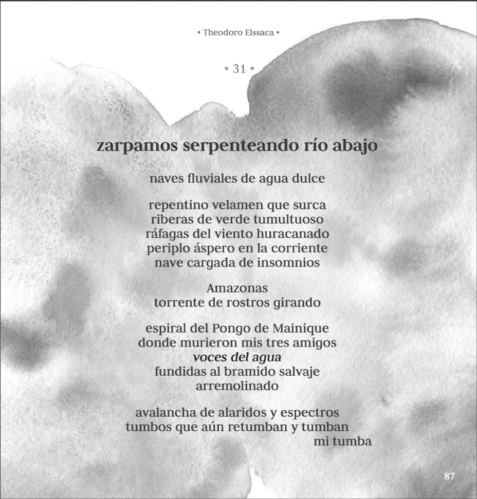 Entre otras intervenciones, el poeta Matías Escalera, quien actualmente es asesor internacional de la revista de filología Verba Hispánica, editada por la Universidad de Ljubljana (capital de Eslovenia), en la que fue profesor, expresó: “Theodoro Elssaca es algo más que un gran poeta y escritor, es un artista integral: fotógrafo antropologista de excelencia, editor, ilustrador sensible, pintor y autor de caligramas. También es un conocedor eximio de las culturas originarias de América, que ha estudiado y visitado desde los años ochenta. Está su faceta menos conocida de expedicionario, baste recordar su trágica experiencia en el Amazonas, donde estuvo perdido por meses (1987), entre las tribus Sharanahua, Machiguenga, Aguaruna -con las que convivió aprendiendo sus dialectos-, donde tuvo lugar el fatal accidente fluvial que costó la vida a los tres expedicionarios que lo acompañaban, durante el naufragio en el río Amazonas, ellos eran el antropólogo, ornitólogo y botánico, a quienes dedicó su libro El espejo humeante-Amazonas (2005), con prólogo del filósofo Gastón Soublette y presentación del poeta español Rafael Alberti. Cabe destacar su expedición a Rapa Nui (1988), donde trabajó con parte del equipo de Jacques Cousteau, cuyo asesor para la Polinesia prologó su libro bilingüe Isla de Pascua – Hombre Arte Entorno. Experiencias profundas de las que ha dejado constancia literaria, ensayística, poética y artística, que ponen en valor su obra, pensamiento y legado”.