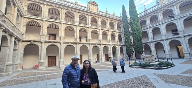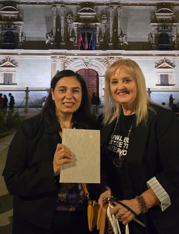 Conversación y lectura a dos voces. El suceso transcurrió el viernes 17 de octubre 2025, en la sala de la Dra. María Isidra de Guzmán, primera Doctora en Humanidades del mundo (siglo XVI), que está situada en el primero de los patios de la universidad cisneriana. La Universidad de Alcalá de Henares, creada por Alejandro VI, en 1499, ha sido declarada Patrimonio Mundial por la Unesco, en 1988, donde se realiza la ceremonia de entrega del prestigioso Premio Cervantes.