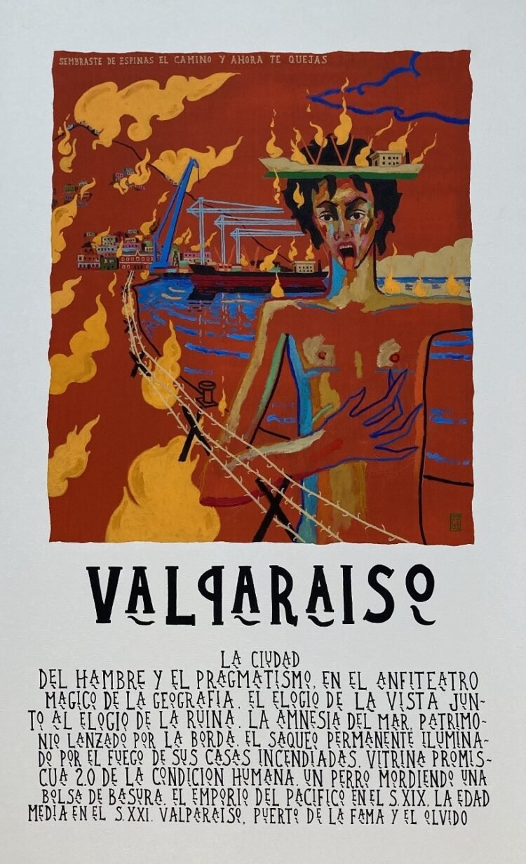 El nombre de la exposición no es casualidad. “Valparaíso para Principiantes y Moribundos” encierra una gran crítica del artista frente a una triste realidad y ha querido dejar su legado tanto para la juventud como para quienes también tienen ya sus buenos años en el cuerpo y han vivido mirando cómo su ciudad querida ha ido desmoronándose.