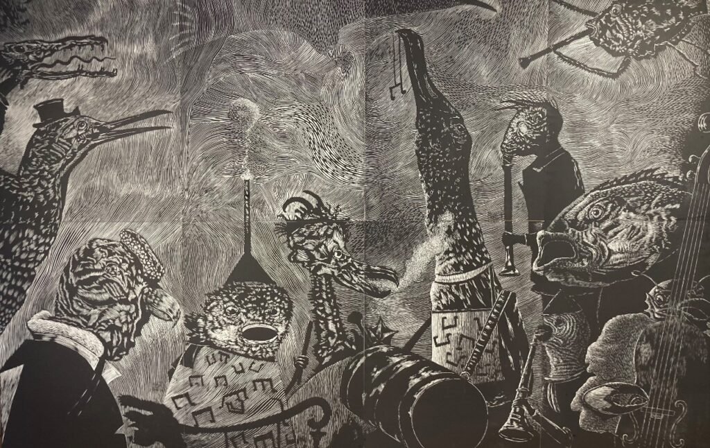 Esta obra se llama “Sobrevivir en aguas de tempestad” y es el homenaje que el pintor Nicolás Julio Aranda hace a Omar Gatica.