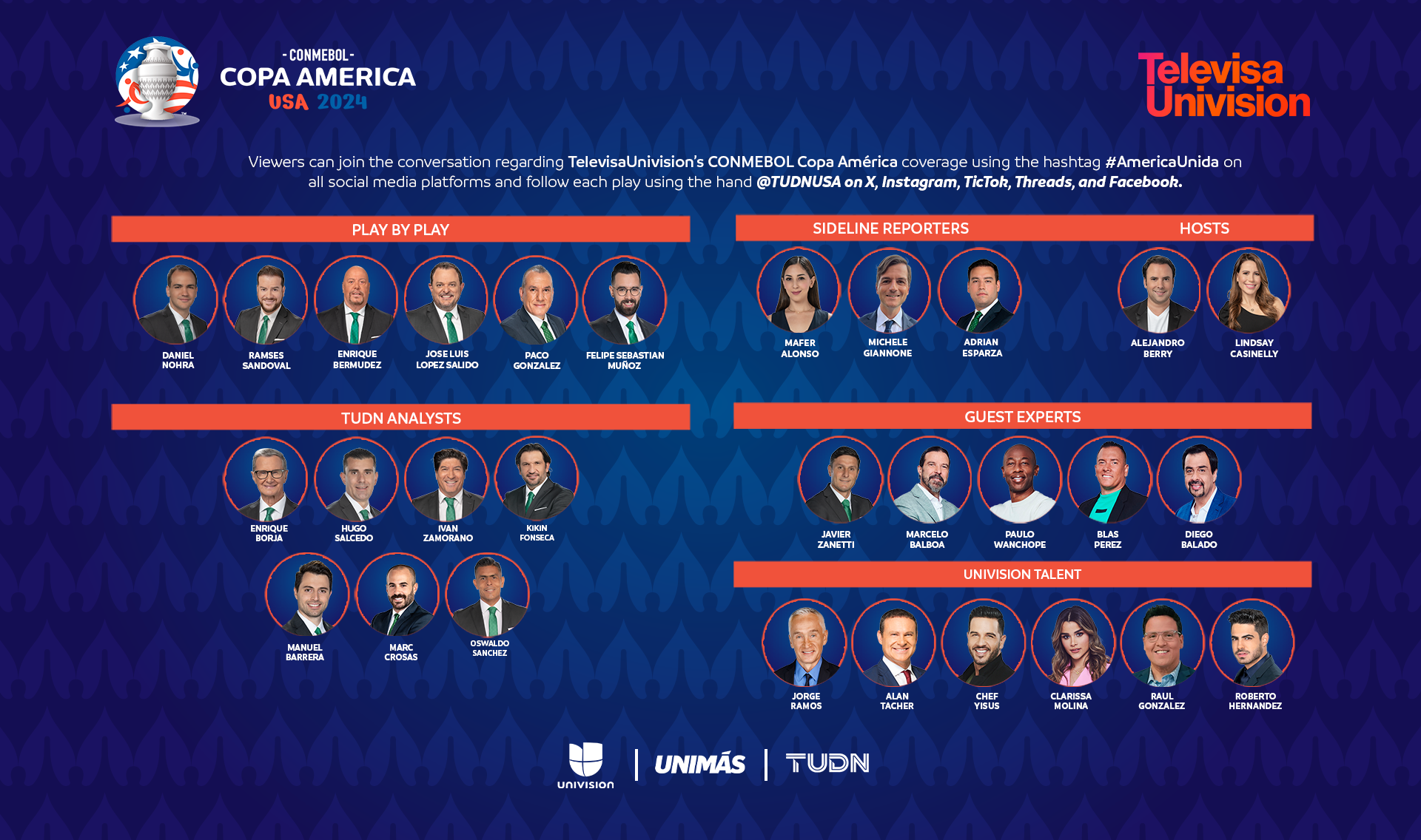 | MIAMI, FL – 10 de junio de 2024 – TelevisaUnivision, la empresa de medios de comunicación en español líder en el mundo hoy anunció el equipo que estará al frente de la cobertura de la CONMEBOL Copa América 2024 en Estados Unidos. El evento deportivo más esperado de las Américas, que se transmitirá a través de las redes y plataformas de TelevisaUnivision a partir del jueves 20 de junio, contará con las voces más confiables y especializadas en deportes, junto con leyendas del fútbol y notables talentos de Univision.